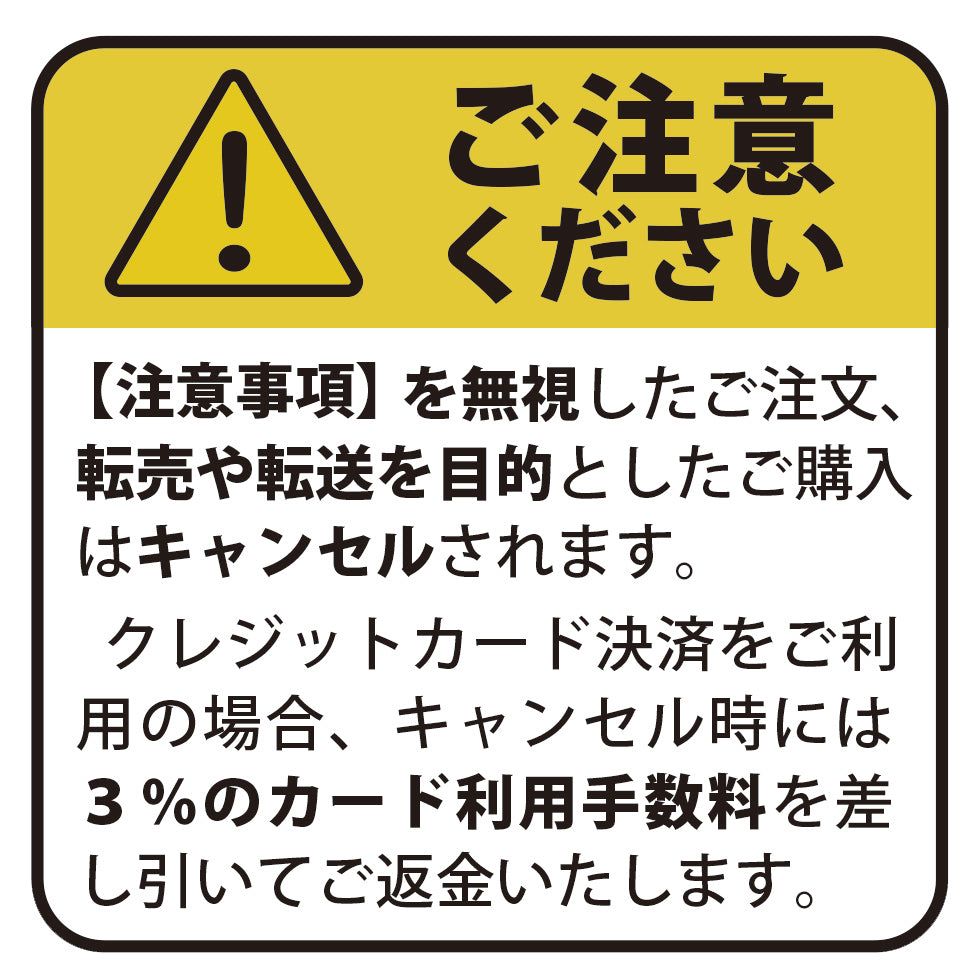 ・以下の【注意事項】を無視したご注文、転売や転送目的のご購入は自動的にキャンセルされます。