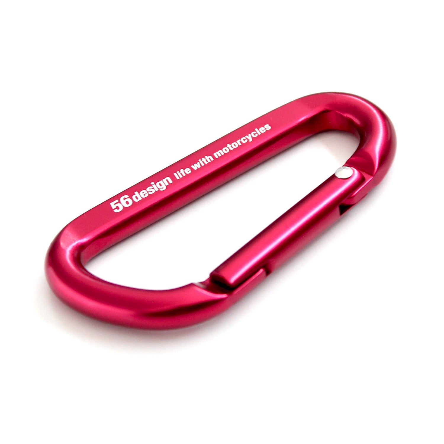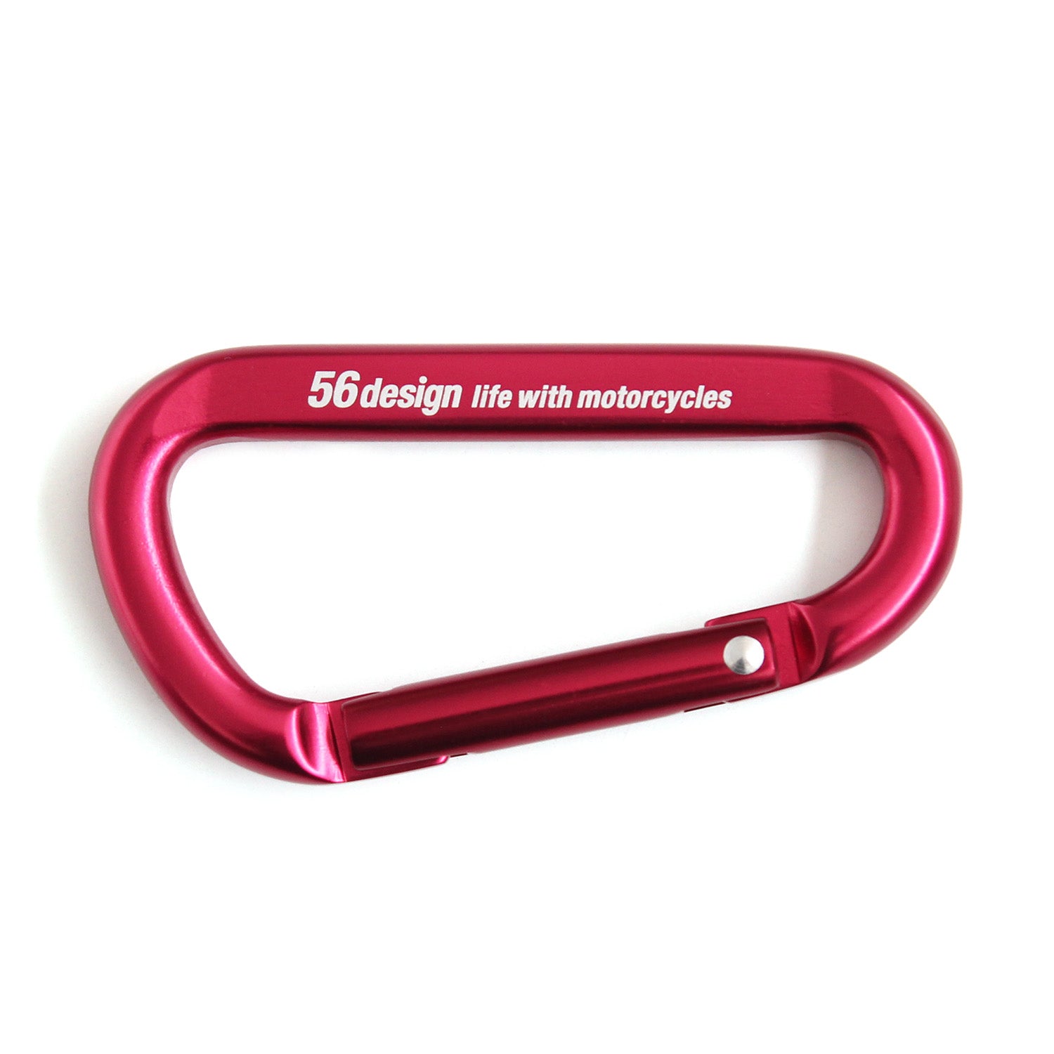 シックなブラックアルマイト加工のアルミニウム製カラビナに、56designロゴをレーザー刻印。